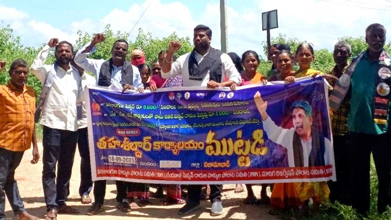 మంద కృష్ణ మాదిగ నాయకత్వంలో మూడు నెలలుగా పింఛన్ల పెంపు కోసం అవిశ్రాంతంగా పోరాడుతున్నామని.. కానీ సీఎం ఏమాత్రం పట్టించుకోవట్లేదని ఆవేదన వ్యక్తం చేశారు. అనంతరం భీమ్గల్ తహశీల్దార్కు వినతిపత్రం అందజేశారు. ఈనెల 20న జీపీల ముట్టడి నిర్వహించనున్నట్లు తెలిపారు. కార్యక్రమంలో ఎమ్మార్పీఎస్ భీమ్గల్, ధర్పల్లి ఇన్ఛార్జీలు దీపక్, రాజేందర్, సుధీర్, వీహెచ్పీఎస్ నాయకులు మోహన్, బాపూరావు, భూమన్న, మహిళలు తదితరులు పాల్గొన్నారు.