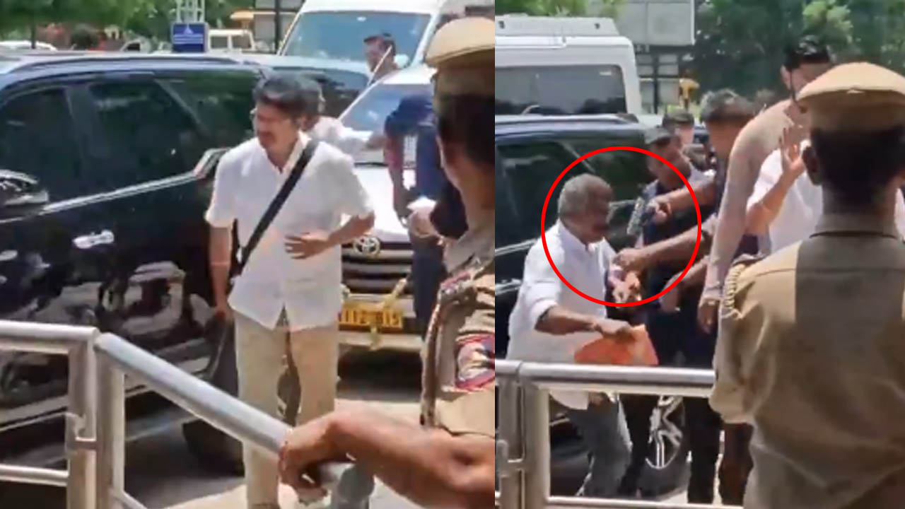 తమిళ్ సూపర్ స్టార్ విజయ్ (Tamil superstar Vijay) మధురై విమానాశ్రయంలో కనిపించారు. దాంతో అభిమానులు (Fans) ఒక్కసారిగా ఆయన్ను కలిసేందుకు, ఆయన్ను చూసేందుకు ఎగబడ్డారు. ఒక అభిమాని విజయ్ వైపు వస్తూ ఉండగా బాడీగార్డ్ (bodyguard) ఒకరు ఏకంగా పిస్టల్ (pistol) తీసి అభిమాని తలకు గురి పెట్టడం హాట్ టాపిక్ అయింది. విజయ్ ఎక్కడకు వెళ్లినా జనాలు పెద్ద ఎత్తున రావడం సహజం. సెక్యూరిటీ విషయంలో జాగ్రత్తలు తీసుకోవాలి. కాని ఇలా జనాల మీదకి గన్ పెట్టి బెదిరించడం సరైన పద్దతి కాదు అని పలువురు తమ అభిప్రాయం తెలియజేస్తున్నారు. పబ్లిక్ ప్లేస్లో (public place) ఫేమస్ పర్సన్స్ కనిపిస్తే జనాలు రావడం సహజం.
