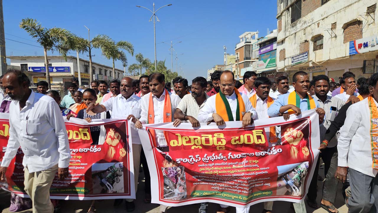 అక్షరటుడే, ఎల్లారెడ్డి : Yellareddy | ఎల్లారెడ్డిలో విపక్షనాయకుల ఆధ్వర్యంలో శుక్రవారం తలపెట్టిన బంద్ ప్రశాంతంగా కొనసాగుతోంది. సోమార్పేట్ లో ఈనెల 15న జరిగిన ఘటనలో పోలీసుల తీరుకు నిరసనగా శుక్రవారం బంద్కు పిలుపునిచ్చిన విషయం తెలిసిందే. ఈ సందర్భంగా పట్టణంలోని వాణిజ్య, వ్యాపార సముదాయాలు, ప్రైవేట్ విద్యాసంస్థలు స్వచ్ఛందంగా బంద్ పాటిస్తున్నాయి. విపక్ష నాయకులు, సోమార్పేట్ (Somarpet) గ్రామస్థులు పట్టణంలోని ప్రధాన వీధుల గుండా తిరుగుతూ బంద్కు మద్దతు పలకాలని కోరారు.
