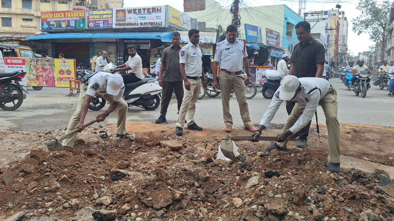 అక్షరటుడే, నిజామాబాద్ సిటీ : Nizamabad Traffic Police | నగరంలో మట్టిని తవ్వి వదిలేసిన గుంతలను ట్రాఫిక్ పోలీసులు(Traffic Police) మంగళవారం ఉదయం పూడ్చారు. కేబుల్ ఆపరేటర్లు నగరంలోని దేవీ రోడ్డు(Devi Road), ఫ్లై ఓవర్ బ్రిడ్జి దగ్గర గుంతలు తవ్వి వదిలేశారు.