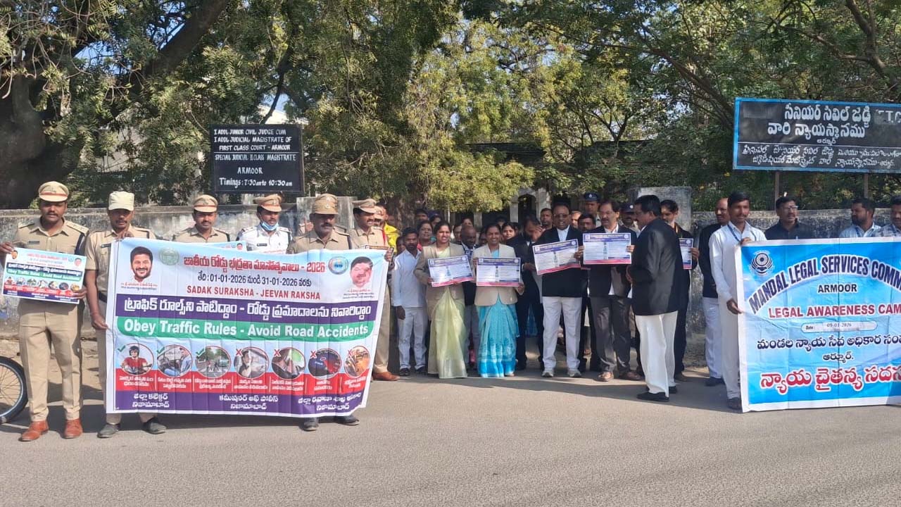 ఆర్మూర్ కోర్టు (Armoor Court) ఆవరణ నుంచి ప్రారంభమైన ఈ ర్యాలీ అంబేడ్కర్ చౌరస్తా, బస్టాండ్ వరకు నిర్వహించారు. సందర్భంగా ఆమె మాట్లాడుతూ.. మద్యం సేవించి వాహనాలు నడపకూడదని, హెల్మెట్ ధరించాలని సూచించారు. నిబంధనలు పాటిస్తూ.. ప్రమాదాలను నివారించాలన్నారు. అనంతరం బస్టాండ్లోని ప్రయాణికులకు ట్రాఫిక్ నిబంధనలపై అవగాహన కల్పించారు. ఈ కార్యక్రమంలో అడిషనల్ జూనియర్ సివిల్ జడ్జ్ భవ్యశ్రీ, ఆర్మూర్ ఎంవీఐ రాహుల్ కుమార్, ఆర్మూర్ ఎస్హెచ్వో సత్యనారాయణ గౌడ్, ట్రాఫిక్ ఎస్సై రఘుపతి, ఆర్మూర్ బార్ అసోసియేషన్ అధ్యక్షుడు శ్రీధర్, న్యాయవాదులు, పోలీస్, ఎంవీఐ సిబ్బంది పాల్గొన్నారు.