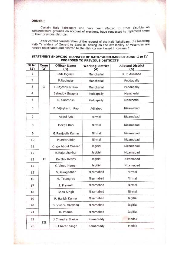 లోక్సభ ఎన్నికల సందర్భంగా పరిపాలనా కారణాలతో అప్పట్లో తహశీల్దార్లను ఇతర జిల్లాలకు బదిలీ చేశారు. అప్పటి నుంచి వారు ఆ ప్రాంతాల్లోనే విధులు నిర్వహిస్తున్నారు. తిరిగి తమ పాత స్థానాలకు పంపాలని సీసీఎల్ను వారు అభ్యర్థించారు. వారి అభ్యర్థనను పరిశీలించిన సీసీఎల్ఏ చీఫ్ కమిషనర్ జోన్-1, 2, 3లలో బదిలీలు నిర్వహించి ఉత్తర్వులు జారీ చేశారు.