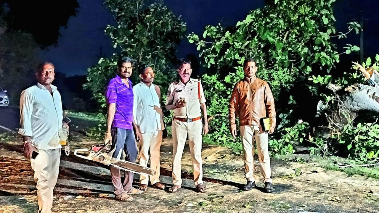 అక్షరటుడే, ఎల్లారెడ్డి:Yellareddy | ఈదురుగాలుల దాటికి అర్ధరాత్రి రోడ్డుపై కూలిన చెట్టును పోలీసులు తొలగించారు. ఎల్లారెడ్డి పోలీస్ స్టేషన్(Yella Reddy Police Station) పరిధిలోని కామారెడ్డి–ఎల్లారెడ్డి మార్గంలో ఓ పెద్ద మర్రి చెట్టు రోడ్డుపై కూలిపోయింది. ప్రధాన రహదారి కావడంతో వాహనాల రాకపోకలకు అంతరాయం ఏర్పడింది. దీంతో సమాచారం అందుకున్న ఎల్లారెడ్డి పోలీసులు(Yella Reddy Police) రాత్రి శ్రమించి దానిని తొలగించారు. కట్టింగ్ మిషన్, జేసీబీ సాయంతో చెట్టును తొలగించారు. ఎల్లారెడ్డి పోలీసులను ఎస్పీ రాజేశ్ చంద్ర(SP Rajesh Chandra) అభినందించారు.
