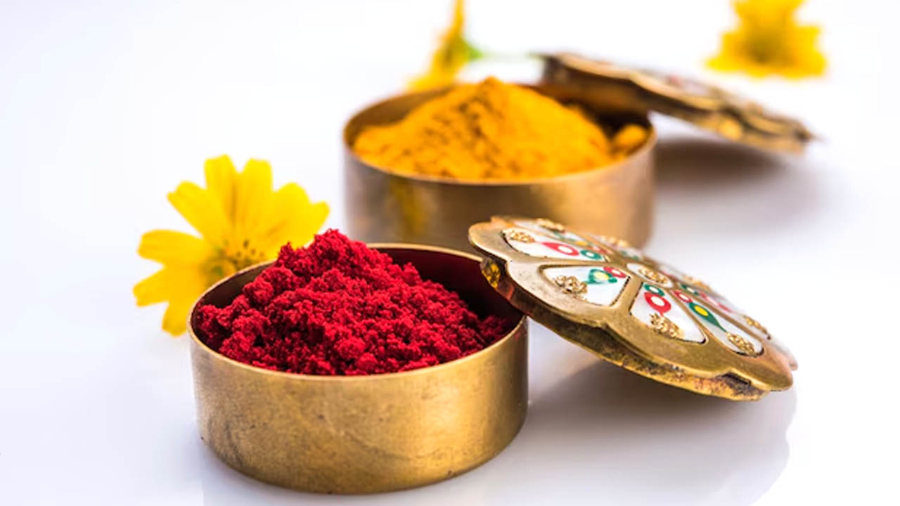 కుంకుమ: కుంకుమను ముఖ్యంగా పసుపు, నిమ్మకాయ రసం (lemon juice) లేదా సున్నంతో తయారు చేస్తారు. దీని రంగు ముదురు ఎరుపుగా ఉంటుంది. కుంకుమను దేవతలకు పూజ చేసేటప్పుడు, నుదుట బొట్టుగా పెట్టుకోవడానికి ఉపయోగిస్తారు. ఇది శుభానికి, పవిత్రతకు ప్రతీక. ఆడవారు, మగవారు, పెళ్లికానివారు, పెళ్లయినవారు (unmarried or married) అనే తేడా లేకుండా అందరూ కుంకుమను బొట్టుగా పెట్టుకోవచ్చు. కుంకుమను కేవలం ఆధ్యాత్మిక, ఆచార వ్యవహారాల కోసం మాత్రమే వాడతారు.