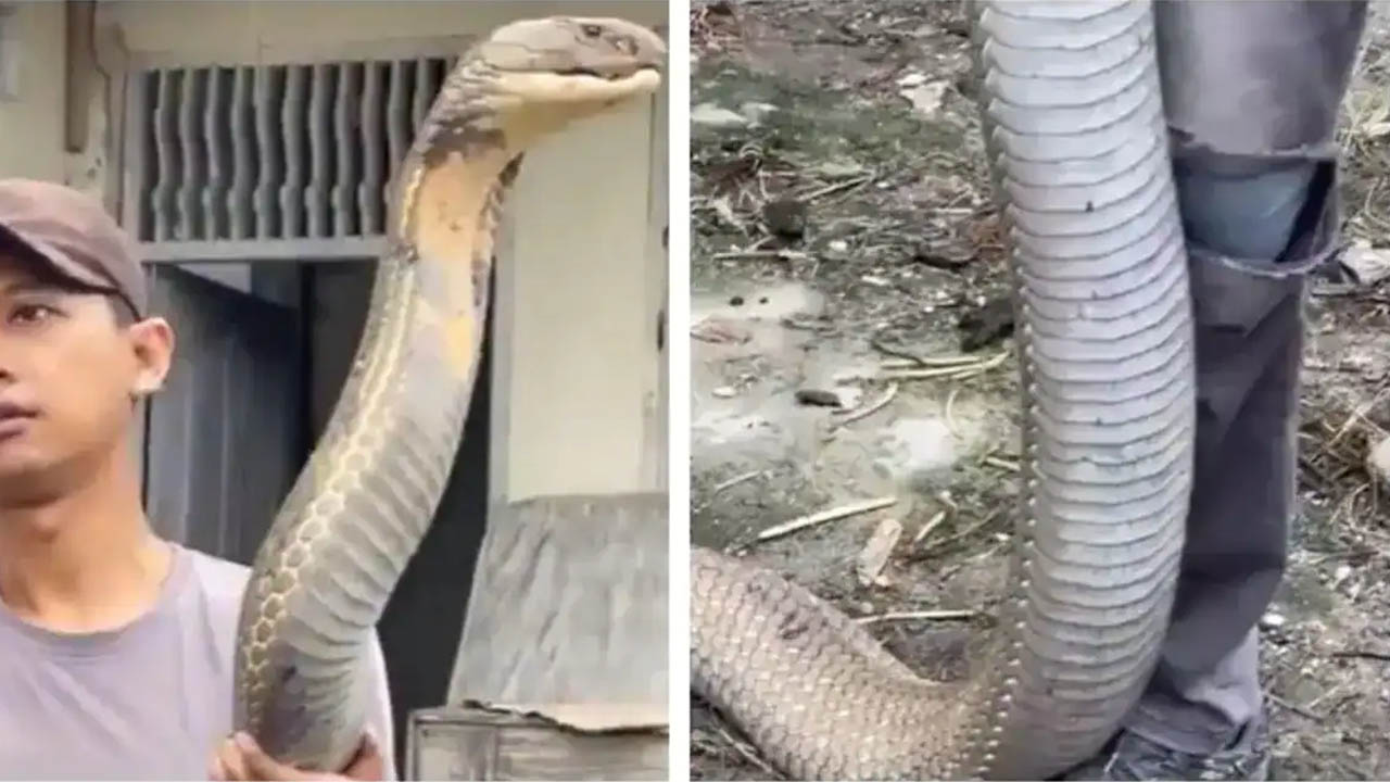 భారతదేశంలో ఇలాంటి కింగ్ కోబ్రాలు తూర్పు, పశ్చిమ కనుమలలో పాటు అసోం, మేఘాలయ, అరుణాచల్ ప్రదేశ్(Arunachal Pradesh) వంటి రాష్ట్రాల్లో కనిపిస్తాయి. వీటి పొడవు సాధారణంగా 18 అడుగులకు చేరుకుంటుంది. ఇది ప్రపంచంలోనే అత్యంత పొడవైన విషపూరిత పాము కూడా. సాధారణంగా ఇవి మనుషుల జోలికి రాకుండా దూరంగా ఉంటాయంటూ నిపుణులు చెప్పుకొస్తున్నారు. ఏది ఏమైనా అతగాడి గుండె ధైర్యానికి అందరు సలాం కొడుతున్నారు.