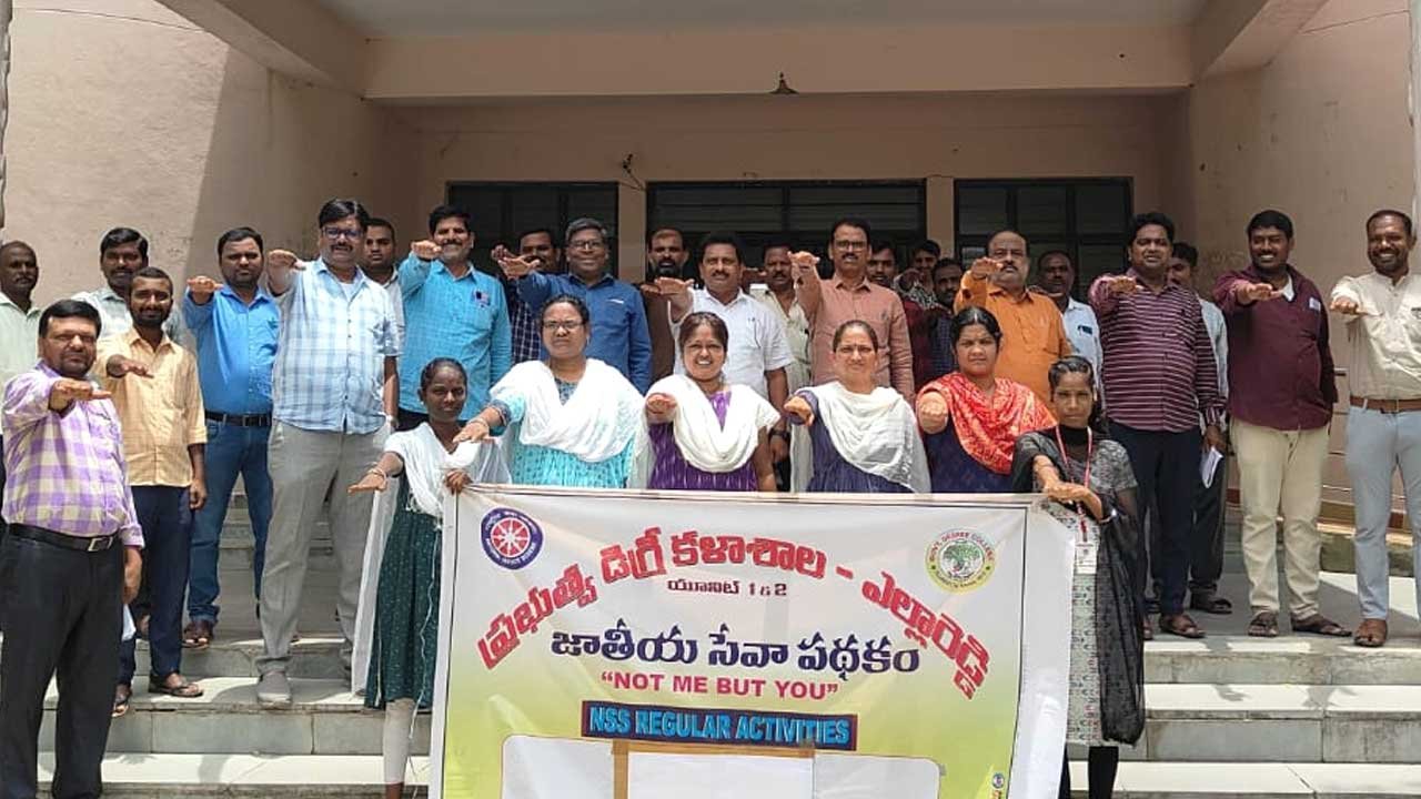 అక్షరటుడే,ఎల్లారెడ్డి: Yellareddy | డ్రగ్స్ రహిత సమాజ నిర్మాణం కోసం యువత ముందుండాలని ఎల్లారెడ్డిలోని ప్రభుత్వ డిగ్రీ కళాశాల (government Degree college) ప్రిన్సిపాల్ డాక్టర్ లక్ష్మీనారాయణ అన్నారు. తెలంగాణ యాంటీ నార్కోటిక్స్ బ్యూరో (Telangana Anti Narcotics Bureau) తరపున ఈరోజు కళాశాలలో అవగాహన కార్యక్రమం నిర్వహించారు. ఈ సందర్భంగా ప్రిన్సిపాల్ ఆధ్వర్యంలో అధ్యాపకులు, సిబ్బంది, విద్యార్థులు ప్రతిజ్ఞ చేశారు. కార్యక్రమంలో వైస్ ప్రిన్సిపాల్ చంద్రకాంత్, కళాశాల మాదకద్రవ్యాల నిరోధక కమిటీ సమన్వయకర్త శంకరయ్య, అధ్యాపకులు జంగం శివకుమార్, అమరేశం, ప్రభాకర్ రావు, అరుణ్ కుమార్, నాగనిక, సిద్దు రాజు, రాణి, గంగారెడ్డి, చంద్రకాంత్, గోదావరి తదితరులు పాల్గొన్నారు.